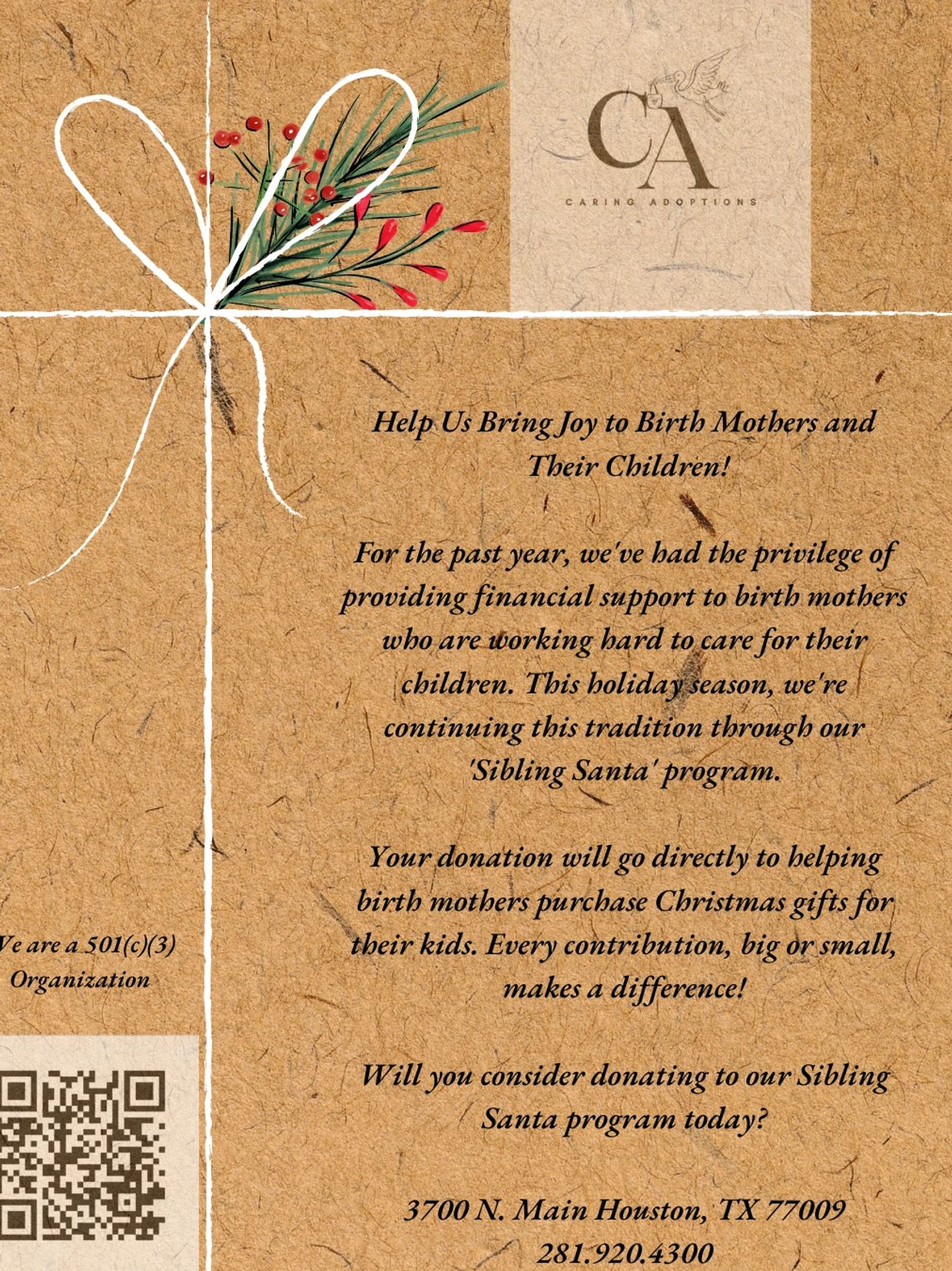 For the past year, we’ve had the privilege of providing financial support to birth mothers who are working hard to care for their children. This holiday season, we’re continuing this tradition through our ‘Sibling Santa’ program.